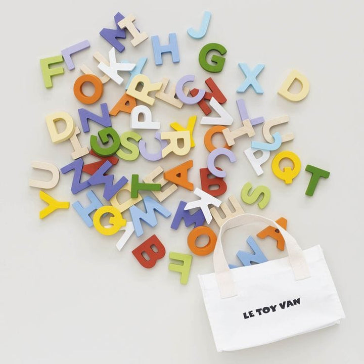 Learn the alphabet with this 60 piece letters set, crafted from sustainable, FSC™ – certified wood. Painted in sweet rainbow shades using child safe, water based stain, it comes complete with a cotton handled storage bag for stowing away safely at the end of a busy play session. Ages 18M+ Material: 90% Plywood, 10% Co