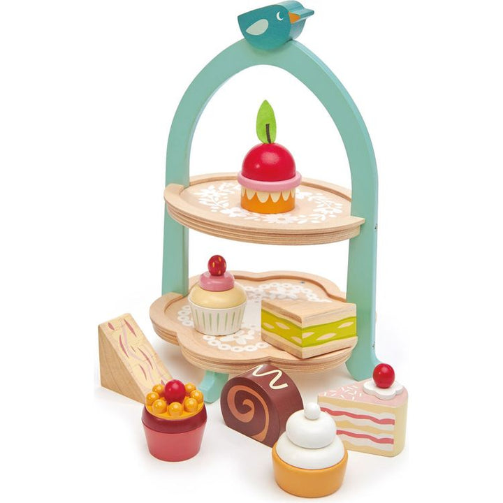 Which mouthwatering delicacy will you choose? A ham or cucumber sandwich, a lemon meringue pie, a chocolate roll, a slice of Victoria sponge, an apple fancy, or 2 cupcakes? A SWEET AND SAVOURY DELIGHT: Enter the enchanting world of pretend play with the Birdie Afternoon Tea Stand. Indulge in a mouthwatering selection o
