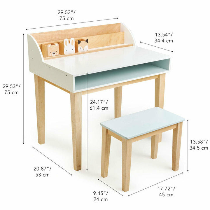 A plywood and rubberwood desk and chair for children that can be placed in a bedroom or nursery is suitable for art and craft activities or homework. Includes 3 handy little wooden pen pots designed to match up with our animal chairs. Material: Wood, Metal Clean with warm towel. Do not use cleaning solution. Keep away
