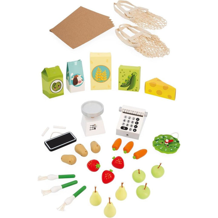 The small producers' market is open! Our wooden Farm Market is the ideal toy for children aged 3 years and up who’ll love pretending to run their own business. This beautiful pretend play toy is equipped with numerous accessories for an enriching and realistic play experience. A total of 58 accessories complete this ch