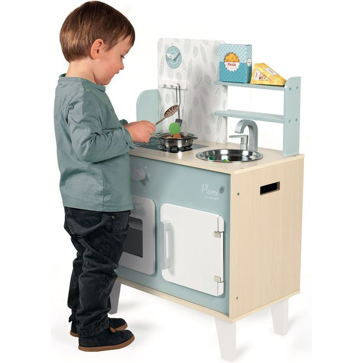 Hurry up! It's all kicking off in the kitchen! We’re rushed off our feet making a perfect meal for mum and dad! With this beautiful kitchen set, children from 3 years old will love putting together their own dishes! To help them become great chefs, this kitchen, made of natural wood and decorated in blues and greys, co