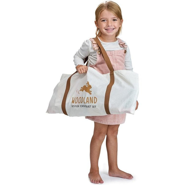 Contained in a practical printed canvas bag with shoulder handle, 6 colourful, illustrated woodland themed croquet hoops, 2 wooden croquet mallets, and 2 wooden painted balls. A squirrel, a rabbit, a bear, a fox, a tree trunk with bird, a toadstool with a mouse, can all be arranged to resemble a forest glade. Perfect f